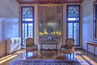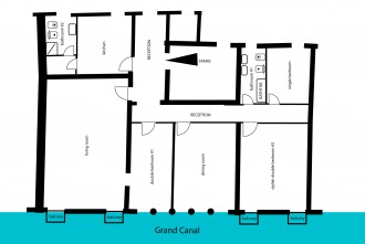 - living room: 2 windows with Grand Canal view, a sofa, 4 armchairs, table, 3 chairs, original Murano glass