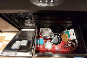 - stylish living room (open space, sunny and large): 2 windows, a sofa, 2 armchairs, blanket box, iPod docking station, flat-screen TV, DVD player Blu Ray player, table and chairs - cooking area: stove-top, kitchen sink, electric oven, dishwasher, refrigerator with freezer, coffee moke, dishes, glasses, cups, bowls, pots