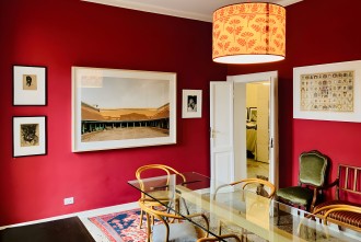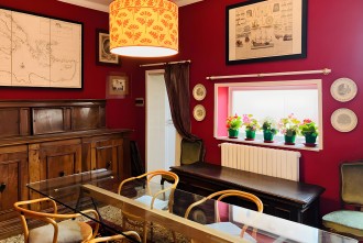 - stylish dining room: a window, original furniture, glass table, chairs, armchairs