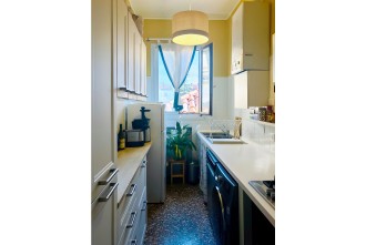 - kitchen: a window, stove-top, electric oven, kitchen sink, refrigerator with freezer, toaster, washing machine, dishwasher, coffee moke, dishes, glasses, cups, bowls, pots